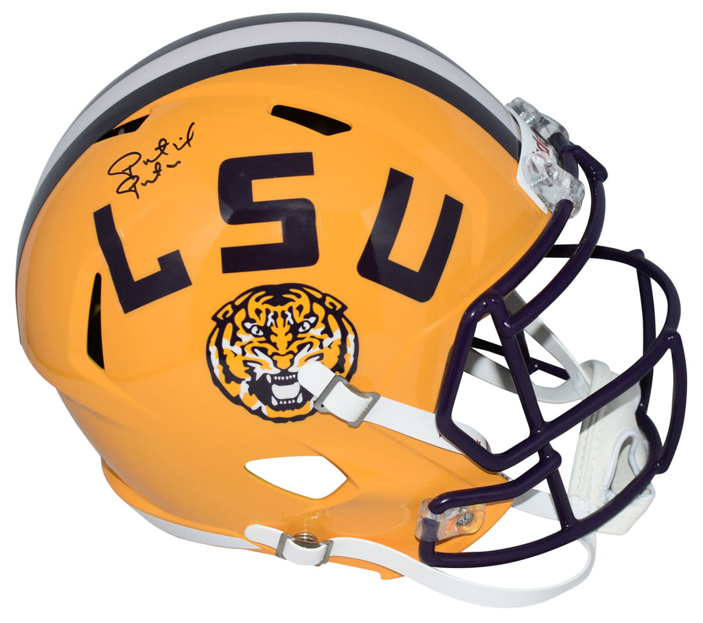 Patrick Peterson, former All-American cornerback for the Tigers, has hand signed this LSU Riddell Speed full-size replica helmet at a private signing. This item is authenticated by Beckett Authentication Services and was signed in the presence of one of their representatives. Their tamper-evident hologram featuring a QR code and serial number is on the item. The authenticity can be verified online by entering the serial number or scanning the QR code.Item pictured may not be the exact item you will receive. It will be similar quality, and we guarantee your satisfaction.