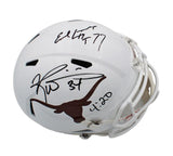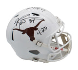 A Texas Longhorns Speed Replica NCAA Helmet Hand Signed by Ricky Williams and Earl Campbell. In addition to signing their names, Ricky inscribed "4:20' and Earl inscribed "HT 77" on the item. AUTHENTICATION: The item is accompanied by a Beckett Serial Numbered and Databased Hologram