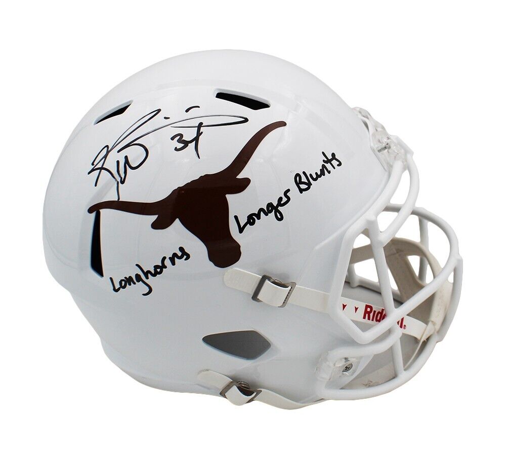 A Texas Longhorns Speed Replica NCAA Helmet hand signed by Ricky Williams. The item and signature are in excellent condition. In addition to signing his name, Ricky also inscribed "Long Horns Longer Blunts" on the item. Ricky won the Heisman Trophy, Maxwell Award, Walter Camp Award, he is a Pro Bowler, and First-team All-Pro. AUTHENTICATION: Your item is tagged with a Ricky Williams Exclusive SmarTag powered by Prova Technology, which gives you digital access to your items authentication records, which include a proof picture from the signing.