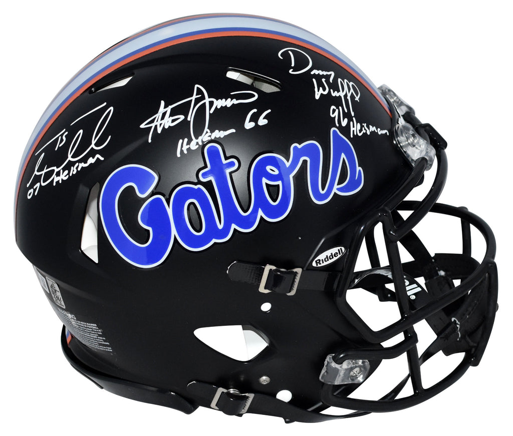 Tim Tebow, Steve Spurrier and Danny Wuerffel, the 3 Heisman Trophy winners for the Gators, have each hand signed this Florida Riddell Speed full-size authentic helmet at a private signing. Each player included his Heisman inscription. This helmet is fully padded inside like the ones worn on the field. This item is authenticated by Beckett Authentication Services and was signed in the presence of one of their representatives. Their tamper-evident hologram featuring a QR code and serial number is on the item. The authenticity can be verified online by entering the serial number or scanning the QR code.Item pictured may not be the exact item you will receive. It will be similar quality, and we guarantee your satisfaction.