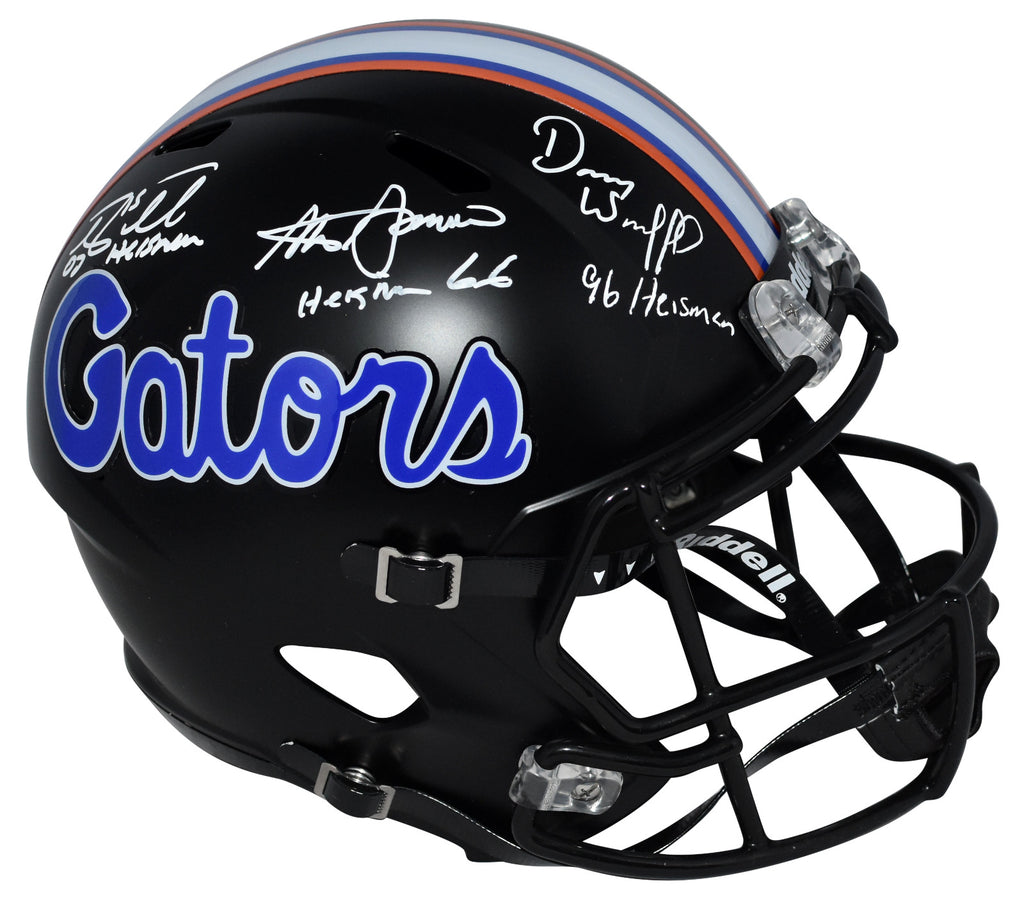 Tim Tebow, Steve Spurrier and Danny Wuerffel, the 3 Heisman Trophy winners for the Gators, have each hand signed this Florida Riddell Speed full-size replica helmet at a private signing. Each player included his Heisman inscription. This item is authenticated by Beckett Authentication Services and was signed in the presence of one of their representatives. Their tamper-evident hologram featuring a QR code and serial number is on the item. The authenticity can be verified online by entering the serial number or scanning the QR code.Item pictured may not be the exact item you will receive. It will be similar quality, and we guarantee your satisfaction.
