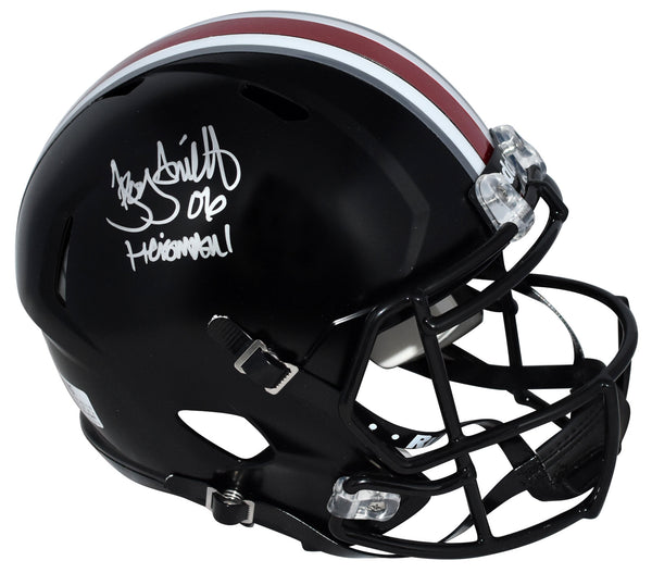 Troy Smith, former Heisman Trophy winning quarterback for the Buckeyes, has hand signed this Ohio State Riddell Speed full-size replica helmet at a private signing. He included the inscription "06 Heisman". This item comes with a certificate of authenticity (COA) from Beckett Authentication Services and was signed in the presence of one of their representatives. You will receive a serial-numbered COA along with a matching serial-numbered sticker on the helmet. The authenticity can be verified online by entering the serial number.Item pictured may not be the exact item you will receive. It will be similar quality, and we guarantee your satisfaction.