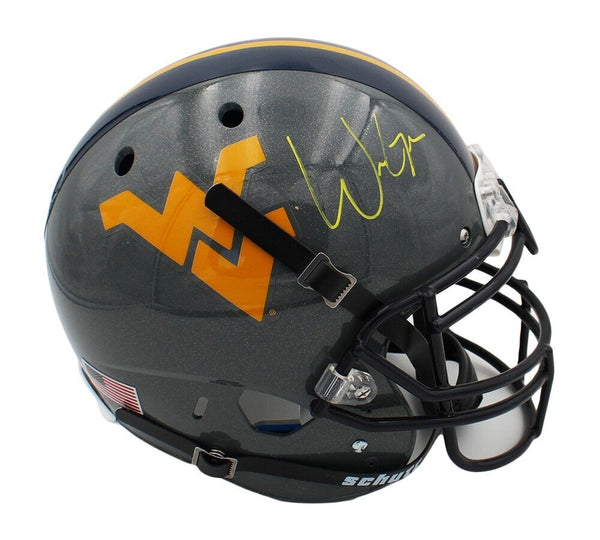 A West Virginia Mountaineers Schutt Authentic Gray NCAA Helmet hand signed Will Grier. The item and signature are in excellent condition. Will is a Second-team All-Big 12 (2018), Big 12 Offensive Newcomer of the Year (2017), and was Mr. Football USA (2013) - AUTHENTICATION: The item is accompanied by a Certificate of Authenticity - Serial Numbered and Databased Hologram