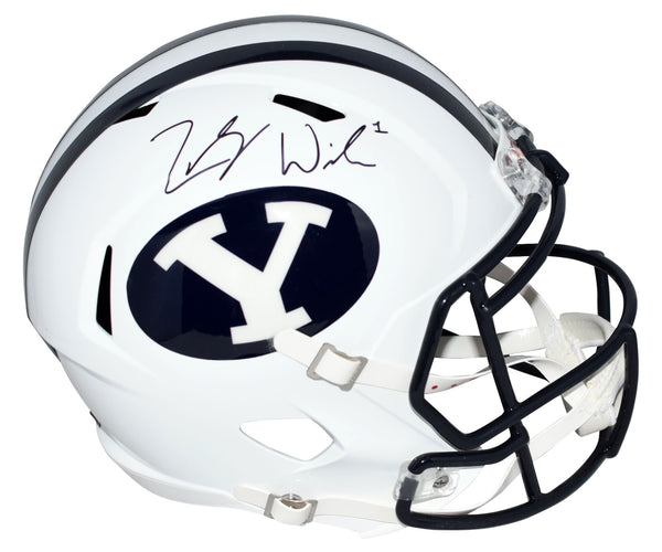 Zach Wilson, former star quarterback for the Cougars, has hand signed this BYU Riddell Speed full-size replica helmet at a private signing. This item comes with a certificate of authenticity (COA) from Beckett Authentication Services and was signed in the presence of one of their representatives. You will receive a serial-numbered COA along with a matching serial-numbered sticker on the helmet. The authenticity can be verified online by entering the serial number.Item pictured may not be the exact item you will receive. It will be similar quality, and we guarantee your satisfaction.
