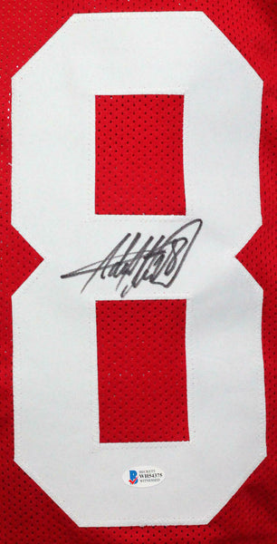 Adrian Peterson Autographed Maroon College Style STAT Jersey - Beckett W*Black*8 THIS IS NOT AN NCAA JERSEY. THIS HAS NO TAGS, NO LOGOS, NO EMBLEMS. This is a Adrian Peterson of the Oklahoma Sooners hand autographed custom made (Non Name Brand) authentic style (Stitched Letters and Numbers) jersey. This item has a Beckett Witnessed Authentication, which comes with a numbered and a matching Beckett Certificate of Authenticity. You can view this item on the Beckett website, it shows when and where the item was signed. It was signed either at a public autograph appearance or a private signing. Although you may not receive this exact item, the item you receive is virtually identical, brand new, and in great shape. Jersey size is XL.