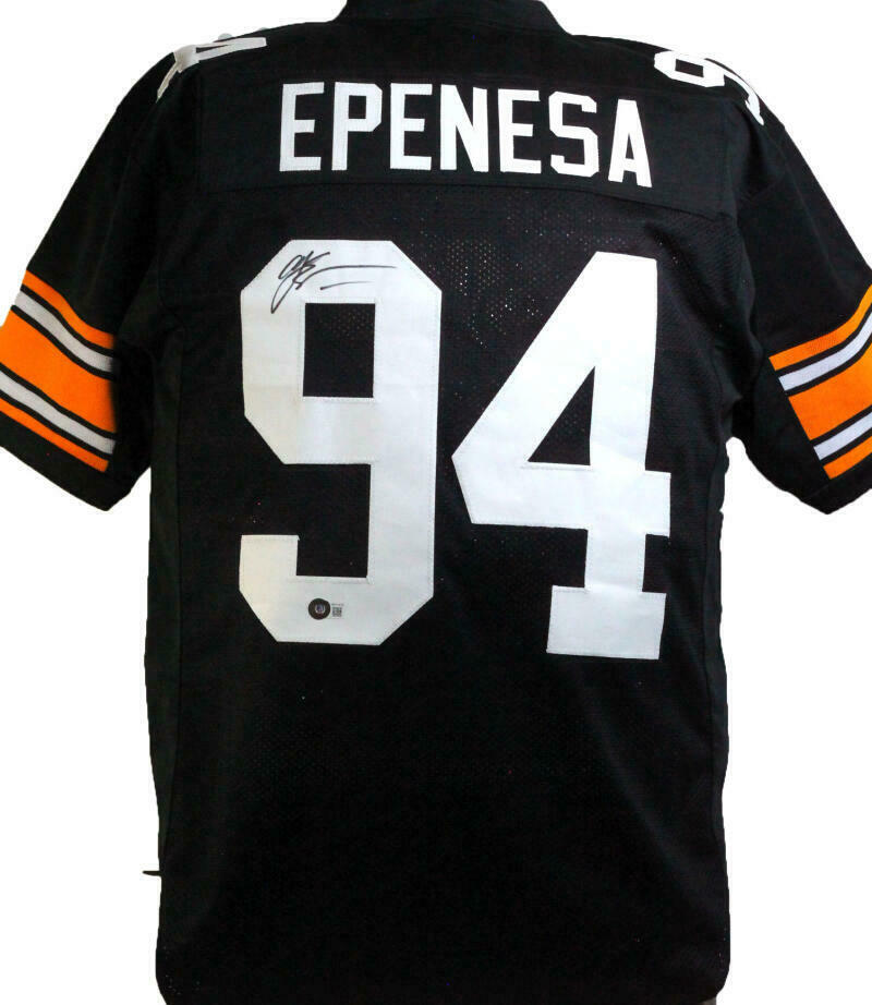 AJ Epenesa Autographed Black College Style Jersey - Beckett W *Black *T9 THIS IS NOT AN NCAA JERSEY. THIS HAS NO TAGS, NO LOGOS, NO EMBLEMS. This is an AJ Epenesa of the Iowa Hawkeyes hand autographed custom made authentic style (stitched letters and numbers) jersey. This item has a Beckett Witnessed Authentication, which comes with a numbered and a matching Beckett Certificate of Authenticity. You can view this item on the Beckett Authentication website and it shows when and where the item was signed. It was signed either at a public autograph appearance or a private signing. This is a stock photo of the item. Although you may not receive this exact item, the item you receive is virtually identical, brand new, and in great shape. Jersey size is XL.