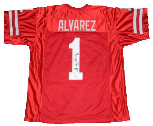 Barry Alvarez, former Hall of Fame head coach for the Wisconsin Badgers, has hand signed this red custom jersey at a private signing. Jersey is size XL and all letters/numbers are sewn-on. This item comes with a certificate of authenticity (COA) from JSA - James Spence Authentication and was signed in the presence of one of their representatives. You will receive a serial-numbered COA along with a matching serial-numbered sticker on the jersey. The authenticity can be verified online by entering the serial number.Item pictured may not be the exact item you will receive. It will be similar quality, and we guarantee your satisfaction.