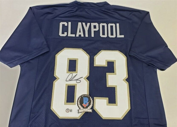 This autographed jersey has been personally hand-signed by Chase Claypool of the Notre Dame Fighting Irish. This autograph is certified by Beckett Authentication Services (BAS) Witness Certification. That means that a Beckett representative was present when this item was signed. It comes with the numbered authentication hologram with a QR code that verifies the authentication on the Beckett website.Custom on-field style jerseys are a more affordable option for autograph seekers. These jerseys do not have any brand name or tags and are made in the Philippines. They feature stitched on names and numbers and are made to look very similar to the on-field jerseys that the players wear. These custom jerseys are very commonly used in the memorabilia industry.