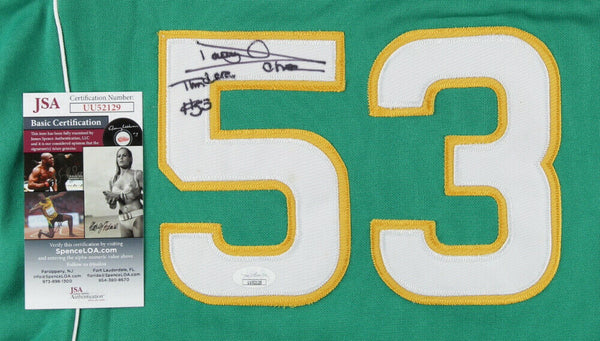 Varsity Legends, Maynard Evans High School (Orlando, Florida) Jersey, size adult Large. Hand-signed and inscribed by Darryl Dawkins (D. 2015)Please note, the jersey has yellowish residue on the rear letter patches as well as the number patches. See photos to confirm the jersey's condition.Darryl Dawkins Passed Away August 27, 2015. He was an American professional basketball player. He was particularly known for his tenure with the NBA's Philadelphia 76ers and New Jersey Nets, although he also played briefly for the Detroit Pistons and Utah Jazz late in his career. His nickname, Chocolate Thunder was bestowed upon him by Stevie Wonder. He was known for his powerful dunks, which led to the NBA adopting breakaway rims due to him shattering a backboard on two occasions in 1979.The lot / autograph(s) includes an official James Spence Authentication (JSA) hologram and matching COA for authenticity purposes.Authentication: JSA COAIn a game against the Kansas City Kings in K.C. on November 13, 1979, Dawkins broke the backboard, sending the Kings' Bill Robinzine ducking. Three weeks later he did it again, this time at home against the San Antonio Spurs at the Spectrum. A few days after that the NBA created a new rule that breaking a backboard was an offense that would result in a fine and suspension.Dawkins named the first backboard-breaking dunk The Chocolate-Thunder-Flying, Robinzine-Crying, Teeth-Shaking, Glass-Breaking, Rump-Roasting, Bun-Toasting, Wham-Bam, Glass-Breaker-I-Am-Jam. He named other dunks as well: the Rim Wrecker, the Go-Rilla, the Look Out Below, the In-Your-Face Disgrace, the Cover Your Head, the Yo-Mama, the Spine-Chiller Supreme, and the Greyhound Special (for the rare occasions when he went coast to coast). The 76ers also kept a separate column on the stat sheet for Dawkins's self-created nicknames: Sir Slam, Dr. Dunkenstein, and Chocolate Thunder. Dawkins also wore gold chain necklaces during games until the end of the 1980 NBA Finals when the NBA banned players from wearing them on court. One gold chain had a cross while the other featured one of his nicknames Sir Slam in gold script. He also had a similar necklace that has another nickname Dr. Dunk in gold script. Sometimes, Dawkins would also shave his head and have it oiled along with wearing an earring.At one point, Dawkins claimed to be an alien from the planet Lovetron, where he spent the off-season practicing interplanetary funkmanship where his girlfriend Juicy Lucy lived.