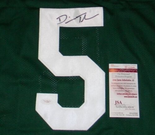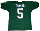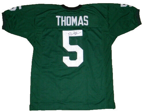 Devin Thomas, former star wide receiver for the Michigan State Spartans, has hand signed this green custom jersey at a private signing. Jersey is size XL and all letters/numbers are sewn-on. This item comes with a certificate of authenticity (COA) from JSA - James Spence Authentication and was signed in the presence of one of their representatives. You will receive a serial-numbered COA along with a matching serial-numbered sticker on the jersey. The authenticity can be verified online by entering the serial number.Item pictured may not be the exact item you will receive. It will be similar quality, and we guarantee your satisfaction.