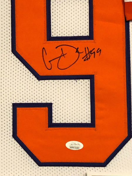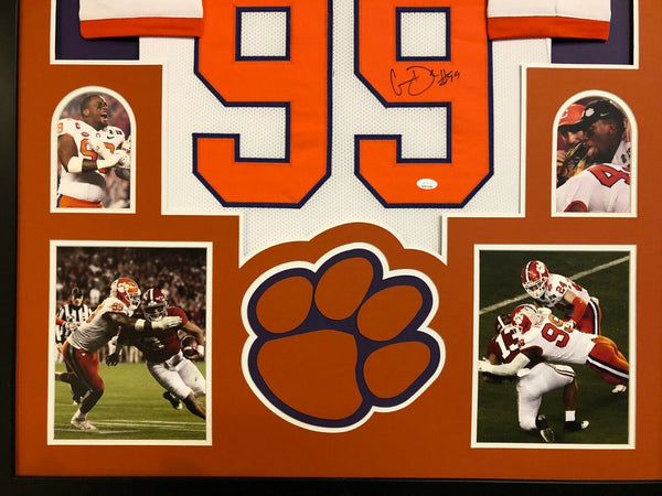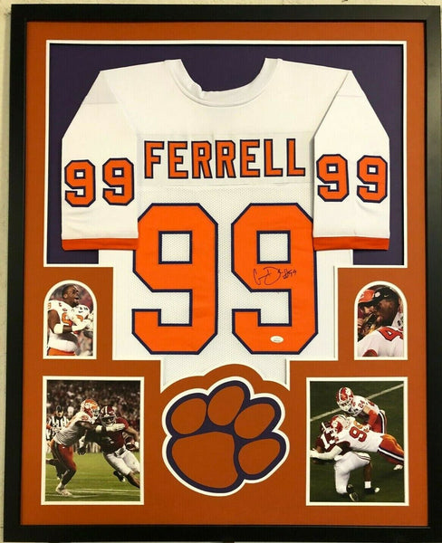 Framed Clelin Ferrell hand signed Clemson Tigers custom jersey. JSA Hologram and COA(WPP575258) The authentication is from JSA. This signature is not authenticated by opinion but it is WITNESSED by a representative of JSA! 100% AUTHENTIC!!! The jersey has fully stitched numbers on the front and back. No tags or logos. This is not an official NCAA jersey but it is very high quality. It is a great item and a must for all great sports fans! This item is professionally framed, it measures 32"x40" inside , 42"x34" outside , using UV protective Acrylic glass for safe keeping and safe transport, team color matting, black moulding and hanging hooks on the back. All additional items in frame seen in pictures included. 100% ready to hang in your fan cave.