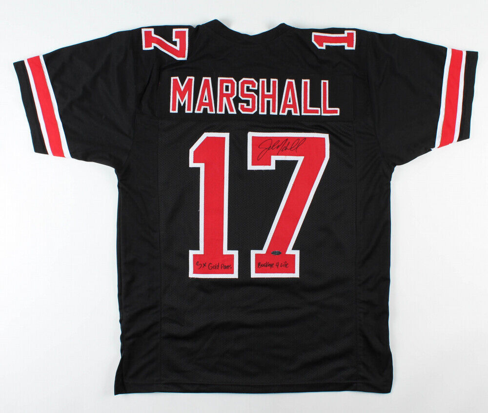 Custom on-field style jersey. Everything is sewn on, size XL. Hand-signed and inscribed by Jalin Marshall. The lot / autograph(s) includes an official Playball Ink hologram for authenticity purposes.Authentication: Playball Ink Hologram