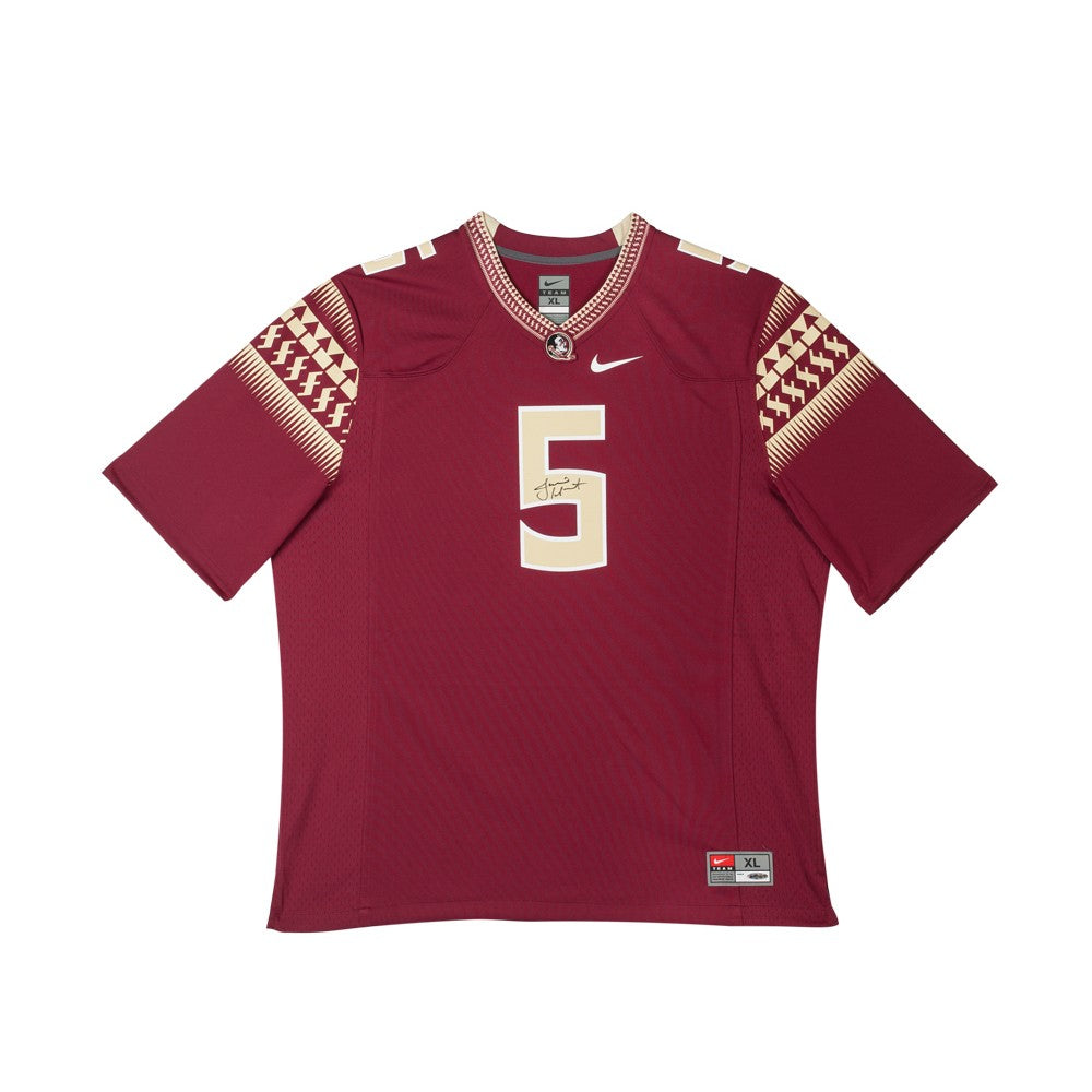 Jameis Winston put together one of the finest freshman college football seasons in the sport's rich history in 2013. He threw for 4,057 yards, 40 touchdowns against just 10 interceptions, and culminated a busy award season by capturing the Heisman Trophy Award. While some athletes would have been satisfied with that, he saved his best for last that season. With the Seminoles down by four points with 1:19 to go in the BCS National Championship Game, Winston took the team on his shoulders on an 80-yard game-winning drive that ended with a 2-yard touchdown pass and cemented his legacy as one of FSU's greatest signal callers of all time. Winston has signed this FSU Garnet Nike replica jersey in black paint pen. His signature is deemed authentic by virtue of Upper Deck Authenticated's Five Step Process.