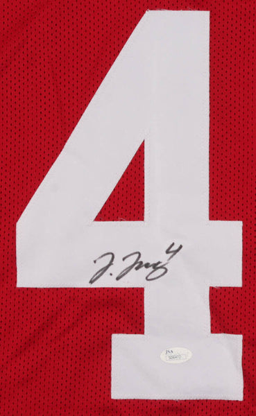 Custom on-field style jersey. Everything sewn on, size XL. Hand-signed in black felt-tip pen by Jerry Jeudy. The autograph(s) includes an official James Spence Authentication (JSA) "Signature Debut" hologram and COA. "Signature Debut" is the autographed memorabilia equivalent to a rookie card. The JSA definition of a "Signature Debut" is as follows: "Any item that is autographed and received by JSA prior to the last game of the signer's official rookie season.Authentication: JSA Signature Debut COA