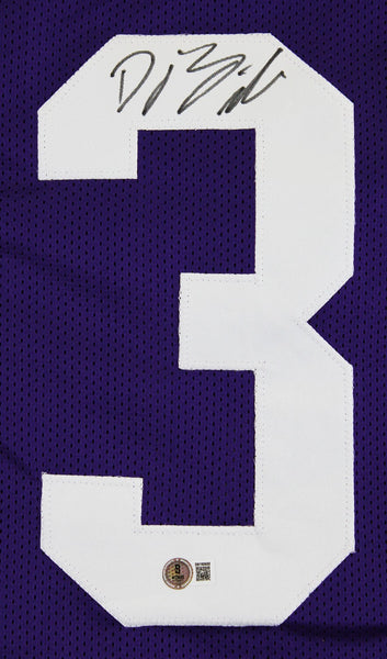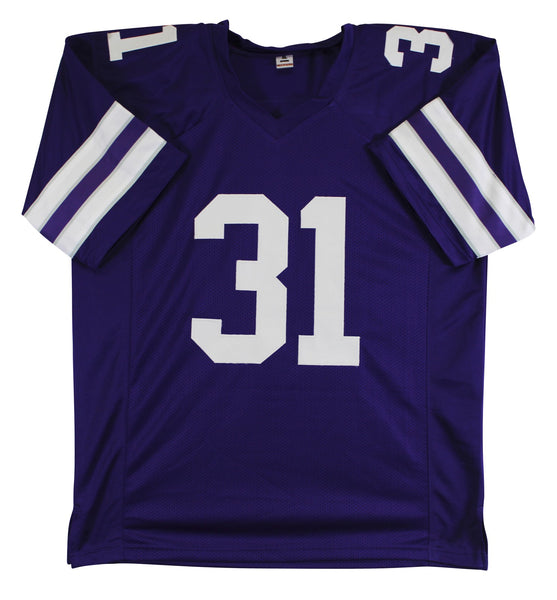 This Autographed Purple Pro Style Jersey has been Personally Signed by D.J. Giddens of the Kansas State Wilcats. This item is 100% Authentic to include a hologram by Beckett Authentication Services. This item will come with an affixed Beckett Authentication Services (BAS) authentication sticker, which includes a scannable QR code to verify authenticity. Please note that Beckett no longer provides serial-numbered COA cards, and the attached BAS sticker will serve as the complete authentication for this item. This is a BAS Witnessed Protection Program item which means a Beckett Authentication Service representative was present when this item was being signed. We conducted an autograph signing with D.J. Giddens where multiples of the same item were signed. While the photographs are representative of this item, the size, placement and strength of the signature may vary. Each item is hand signed, therefore, each autograph is unique. This item can be verified through BAS Witnessed. This is a X-Large sized, non-branded, custom-stitched Jersey.