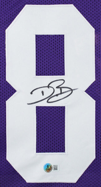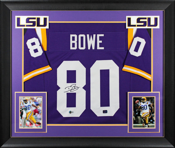 This Autographed Purple Pro Style Framed Jersey has been Personally Signed by Dwayne Bowe of the Louisiana State Tigers. This item is 100% Authentic to include a hologram by Beckett Authentication Services. This item will come with an affixed Beckett Authentication Services (BAS) authentication sticker, which includes a scannable QR code to verify authenticity. Please note that Beckett no longer provides serial-numbered COA cards, and the attached BAS sticker will serve as the complete authentication for this item. This is a BAS Witnessed Protection Program item which means a Beckett Authentication Service representative was present when this item was being signed. We conducted an autograph signing with Dwayne Bowe where multiples of the same item were signed. While the photographs are representative of this item, the size, placement and strength of the signature may vary. Each item is hand signed, therefore, each autograph is unique. This item can be verified through BAS Witnessed. This item has been professionally framed to overall dimensions of approximately 32 x 37 inches. This is a X-Large sized, non-branded, custom-stitched Framed Jersey. This jersey will be framed to order, it will take 3-4 days from purchase date for it to ship.
