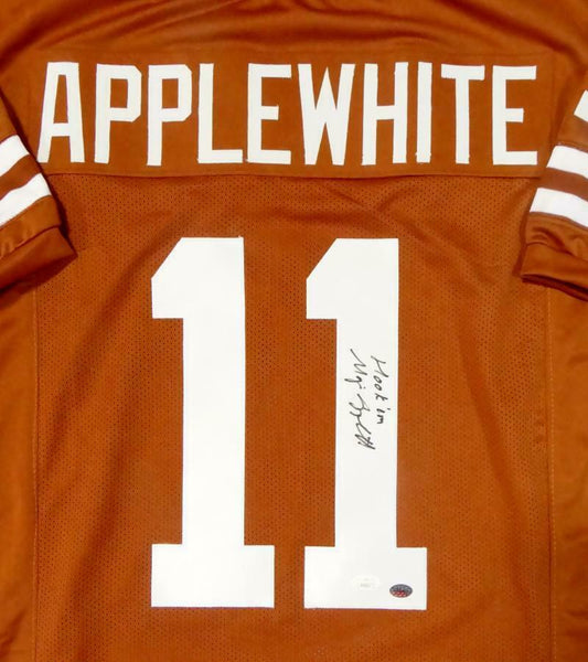 Major Applewhite Autographed Orange College Style Jersey w/Hook Em- JSA Auth *R1 THIS IS NOT AN NCAA JERSEY. THIS HAS NO TAGS, NO LOGOS, NO EMBLEMS. This is a hand autograph of Major Applewhite on a Custom Made (non name brand) Authentic Style Jersey with stitched letters and numbers and inscribed with Hook Em. This item has a James Spence Authentication, which comes with a JSA numbered sticker and a matching Certificate of Authenticity. You can view this item on the SpenceLOA website and it shows when and where the item was signed. It was signed either at a public autograph appearance or a private signing. This is a stock photo of the item. Although you may not receive this exact item, the item you receive is virtually identical and brand new in great shape. Jersey size is XL.