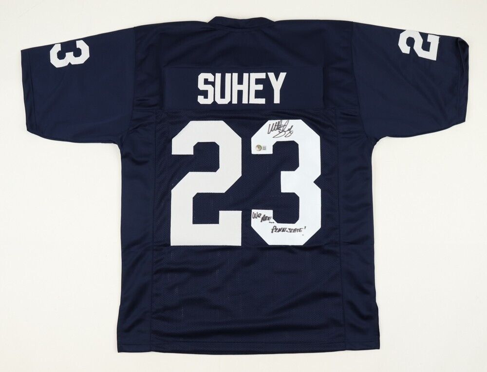 Custom on-field style jersey. Everything sewn on, size XL. Hand-signed and inscribed by Matt Suhey (Chicago Bears).The lot / autograph(s) includes an official Beckett Authentication Services serially numbered hologram and QR Code card for authenticity purposes. The signing of this item was witnessed by Beckett.Authentication: Beckett Hologram with QR Code card