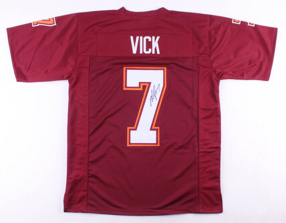 Custom on-field style jersey. Everything is sewn on, size XL. Hand-signed in black felt-tip pen by Michael Vick (Falcons). The lot / autograph(s) includes an official James Spence Authentication (JSA) hologram and matching COA for authenticity purposes. The signing of this item was witnessed by JSA.Authentication: JSA COA