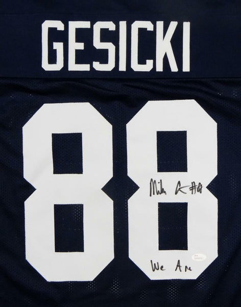 Mike Gesicki Autographed Navy College Style Jersey w/ We Are -JSA Witness Auth *R8 THIS IS NOT AN NCAA JERSEY. THIS HAS NO TAGS, NO LOGOS, NO EMBLEMS. This is a Hand Autograph of Mike Gesicki on a custom made (Non Name Brand) authentic style jersey with stitched letters and numbers and inscribed with We Are. This item has a James Spence Witness Authentication, which comes with a #'ed Sticker and a Matching COA. You can view this item on the SpenceLOA website, it shows when and where the item was signed. It was signed either at a public autograph appearance or a private signing. This is a stock photo of the item. Although you may not receive this exact item, the item you receive is virtually identical and brand new in great shape. Jersey size is XL.