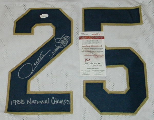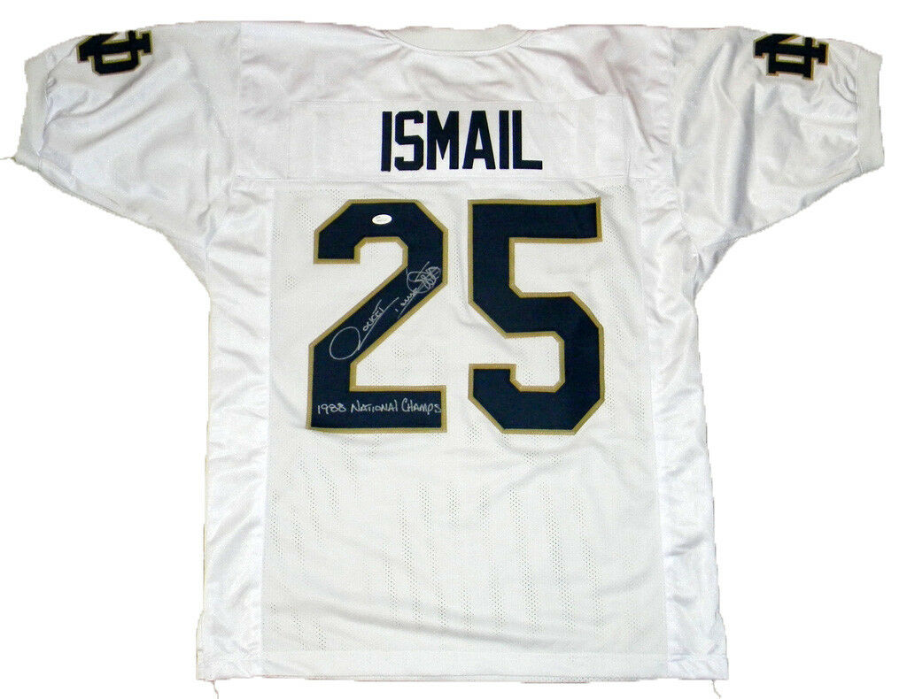 Raghib "Rocket" Ismail, former All-American wide receiver for the Irish, has hand signed this white custom jersey at a private signing. He included the inscription "1988 National Champs" with his signature. Jersey is size XL and all letters/numbers are sewn-on. This item comes with a certificate of authenticity (COA) from JSA - James Spence Authentication and was signed in the presence of one of their representatives. You will receive a serial-numbered COA along with a matching serial-numbered sticker on the jersey. The authenticity can be verified online by entering the serial number.Item pictured may not be the exact item you will receive. It will be similar quality, and we guarantee your satisfaction.