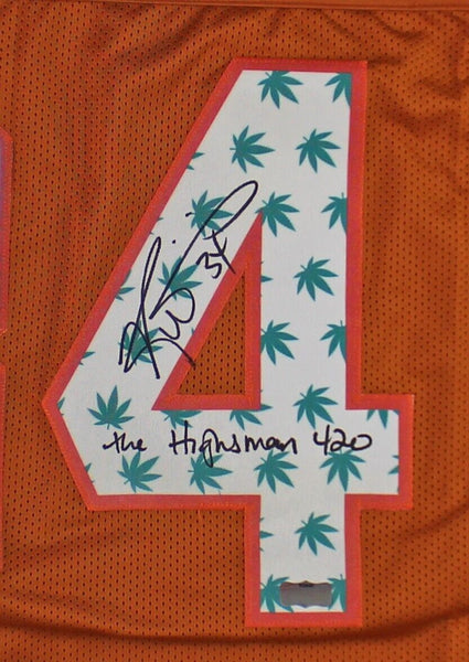 A Texas Custom Orange with Leaves Jersey hand signed by Ricky Williams. The item and signature are in excellent condition. In addition to signing his name, Ricky also inscribed "The Highsman 4:20" on the item. Ricky is a former American football running back who played 11 seasons in the NFL. Ricky played college football for the University of Texas, where he was a two-time All-American and won the Heisman Trophy. Ricky was drafted by the New Orleans Saints before being traded to the Miami Dolphins. He also spent a season with the Baltimore Ravens. AUTHENTICATION: Your item is tagged with a Ricky Williams Exclusive SmarTag powered by Prova Technology, which gives you digital access to your items authentication records, which include a proof picture from the signing.