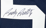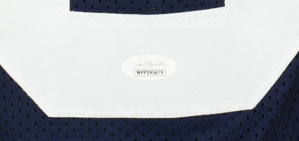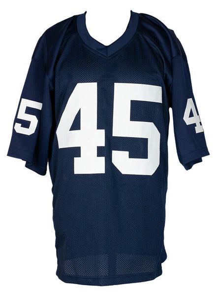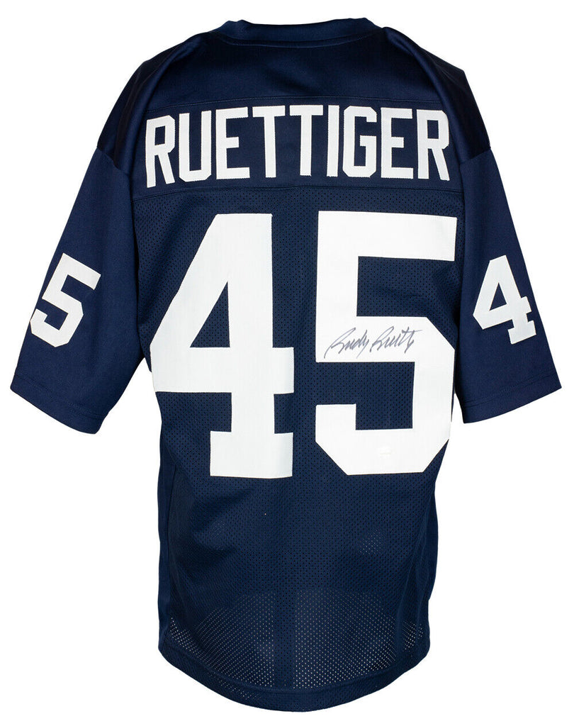Featured is a Rudy Ruettiger signed custom blue football jersey. This jersey was hand signed by Rudy Ruettiger and has been authenticated by JSA authentication services. Included with the jersey is a JSA hologram and certificate of authentication. This jersey would make a great addition to any sports memorabilia collection. This jersey has hand sewn numbers and letter and has NO logos or any affiliation with any manufacturer or team. It is simply intended as an autographed collectible. SPECIFICATIONS Autographed By: Rudy Ruettiger Team: Notre Dame Fighting Irish Sport: Football Authentication: James Spence Authentication (JSA)
