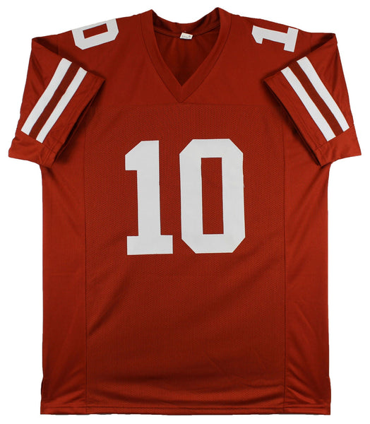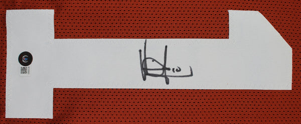 This Autographed Burnt Orange Pro Style Jersey has been Personally Signed by Vince Young of the Texas Longhorns. This item is 100% Authentic to include a hologram by Beckett Authentication Services. This item may come with the new Beckett Authentication hologram that has a scannable QR code rather than the traditional COA. If you would like to have a COA, you are welcome to reach out to Beckett for a printed certification once you receive your item. This is a BAS Witnessed Protection Program item which means a Beckett Authentication Service representative was present when this item was being signed. We conducted an autograph signing with Vince Young where multiples of the same item were signed. While the photographs are representative of this item, the size, placement and strength of the signature may vary. Each item is hand signed, therefore, each autograph is unique. This item can be verified through BAS Witnessed. This is a X-Large sized, non-branded, custom-stitched Jersey.