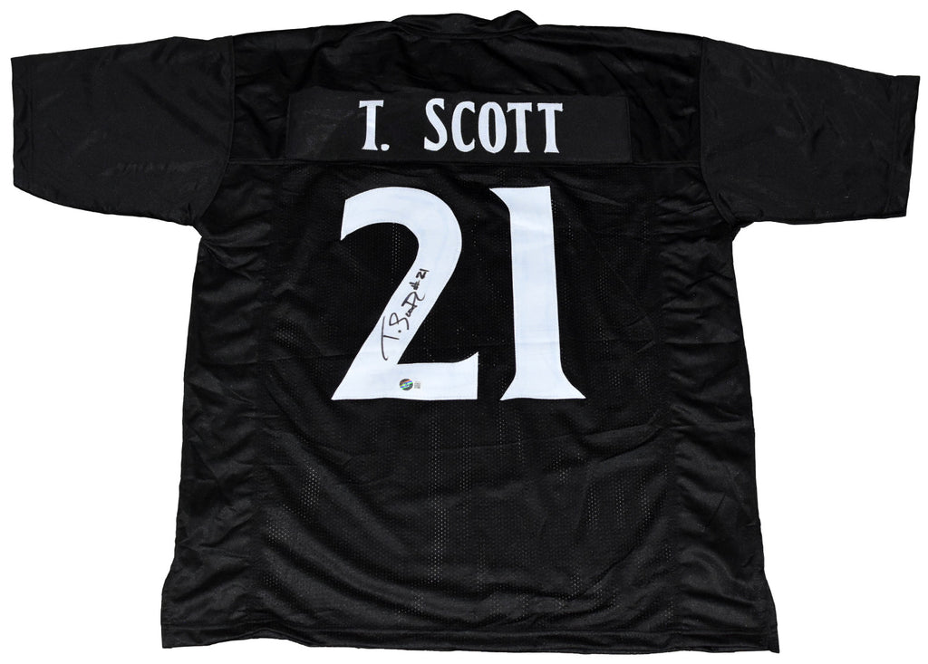 Tyler Scott, former star wide receiver for the Cincinnati Bearcats, has hand signed this black custom jersey at a private signing. Jersey is size L and all letters/numbers are sewn-on. This item is authenticated by Beckett Authentication Services and was signed in the presence of one of their representatives. Their tamper-evident hologram featuring a QR code and serial number is on the item. The authenticity can be verified online by entering the serial number or scanning the QR code.Item pictured may not be the exact item you will receive. It will be similar quality, and we guarantee your satisfaction.