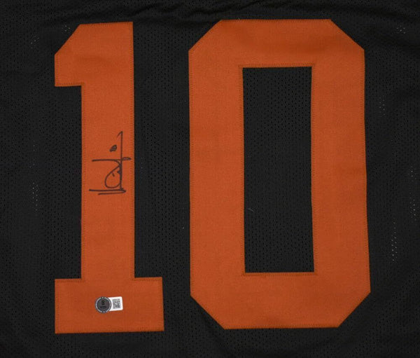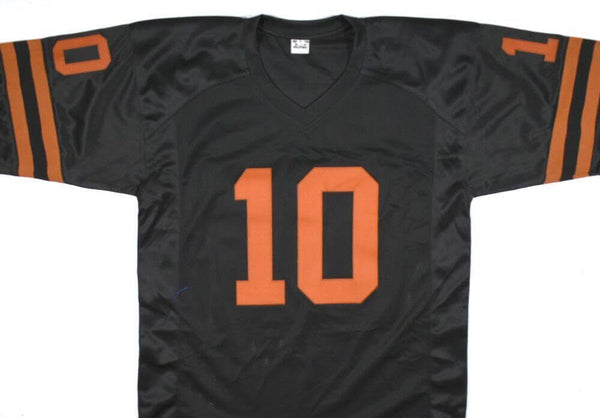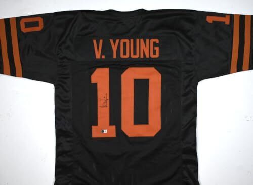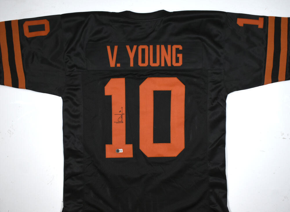 Vince Young Autographed College Black Style Jersey - Beckett W Hologram *Black THIS IS NOT AN NCAA JERSEY. THIS HAS NO TAGS, NO LOGOS, NO EMBLEMS. This is a Hand Autographed Jersey of Vince Young. This is Custom Made (Non Name Brand) Authentic Style (Stitched Letters and Numbers) Jersey. This item has a Beckett Witness Authentication, which Comes with a Beckett hologram and a QR code for verification. You can view this item on the Beckett website, it shows when and where the item was signed. It was signed either at a public autograph appearance or a Private Signing. This is a stock photo of the item. Although you may not receive this exact item, the item you receive is virtually identical and brand new in great shape. Jersey size is XL.