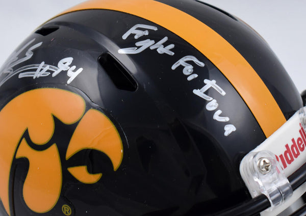 AJ Epenesa Autographed Iowa Hawkeyes Speed Mini Helmet w/Fight for Iowa-Beckett W Hologram *Silver This is an AJ Epenesa of the Iowa Hawkeyes hand autographed Riddell Football Speed Mini helmet. Inscribed Fight for Iowa. This item has a Beckett Witnessed Authentication, which comes with a numbered hologram and a QR code for verification. You can view this item on the Beckett Authentication website and it shows when and where the item was signed. It was signed either at a public autograph appearance or a private signing. This is a stock photo of the item. Although you may not receive this exact item, the item you receive is virtually identical, brand new, and in great shape.