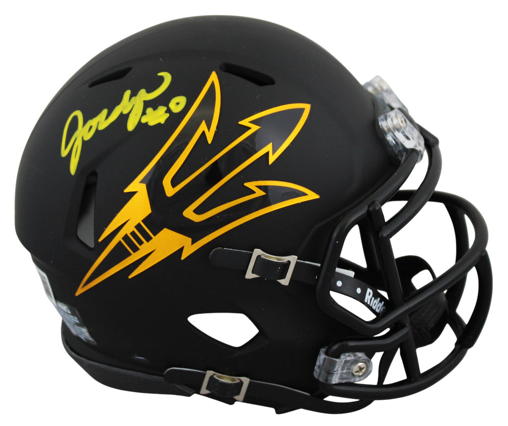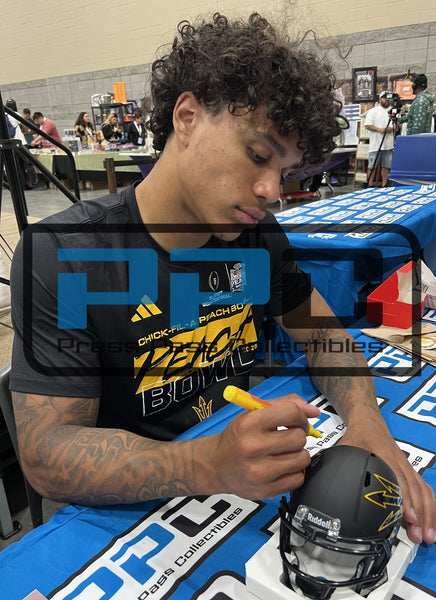 This Autographed Black Speed Mini Helmet has been Personally Signed by Jordyn Tyson of the Arizona State Sun Devils. This item is 100% Authentic to include a hologram by Beckett Authentication Services. This item will come with an affixed Beckett Authentication Services (BAS) authentication sticker, which includes a scannable QR code to verify authenticity. Please note that Beckett no longer provides serial-numbered COA cards, and the attached BAS sticker will serve as the complete authentication for this item. This is a BAS Witnessed Protection Program item which means a Beckett Authentication Service representative was present when this item was being signed. We conducted an autograph signing with Jordyn Tyson where multiples of the same item were signed. While the photographs are representative of this item, the size, placement and strength of the signature may vary. Each item is hand signed, therefore, each autograph is unique. This item can be verified through BAS Witnessed.