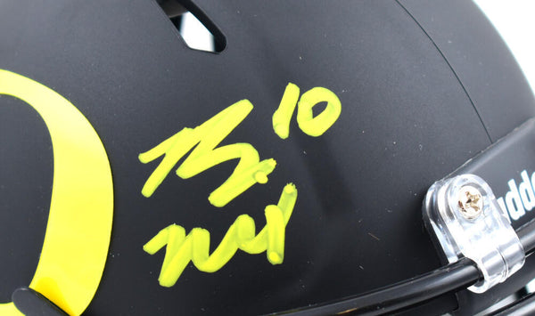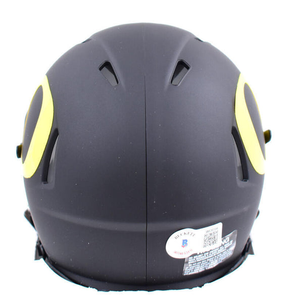 Bo Nix Autographed Oregon Ducks Black Speed Mini Helmet- Beckett W Hologram *Yellow This is a Hand Autographed Helmet of Bo Nix of The University of Oregon. This is a Riddell Football Black Speed Mini Helmet. This item has a Beckett Witness Authentication, which Comes with a Beckett #'ed Sticker hologram and a QR code for verification. You can view this item on the Beckett website, it shows when and where the item was signed. It was signed either at a public autograph appearance or a Private Signing. This is a stock photo of the item. Although you may not receive this exact item, the item you receive is virtually identical and brand new in great shape.