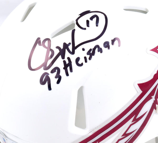 Charlie Ward Autographed Florida State White Speed Mini Helmet w/93 Heisman-Beckett W Hologram *Black This is a hand autographed Helmet of Charlie Ward of the Florida State Seminoles. This is a Riddell Football White Speed Mini Helmet. Inscribed 93 Heisman. This item has a Beckett Witnessed Authentication, which comes with a Beckett numbered hologram and a QR code for verification. You can view this item on the Beckett website and it shows when and where the item was signed. It was signed either at a public autograph appearance or a private signing. This is a stock photo of the item. Although you may not receive this exact item, the item you receive is virtually identical and brand new in great shape.