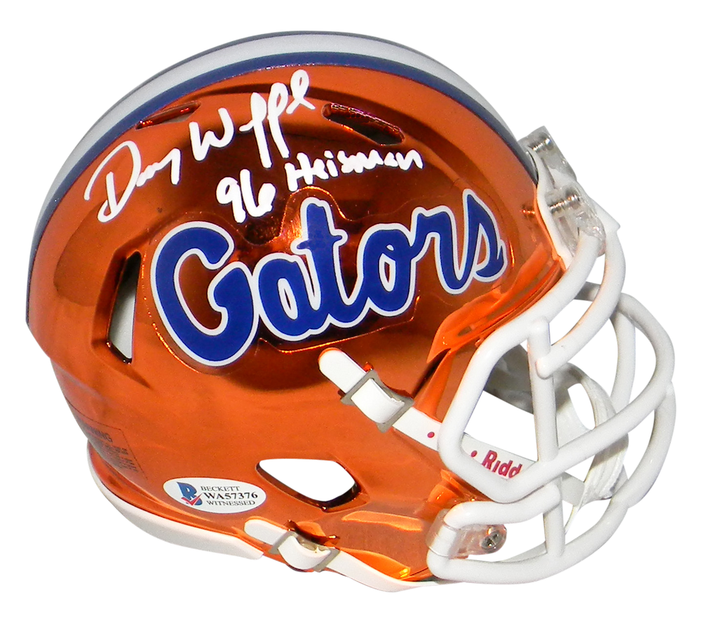 Danny Wuerffel, former Heisman Trophy winning quarterback for the Gators, has hand signed this Florida Riddell Speed mini helmet at a private signing. He included the inscription "96 Heisman" with his signature. This item comes with a certificate of authenticity (COA) from Beckett Authentication Services and was signed in the presence of one of their representatives. You will receive a serial-numbered COA along with a matching serial-numbered sticker on the helmet. The authenticity can be verified online by entering the serial number.Item pictured may not be the exact item you will receive. It will be similar quality, and we guarantee your satisfaction.