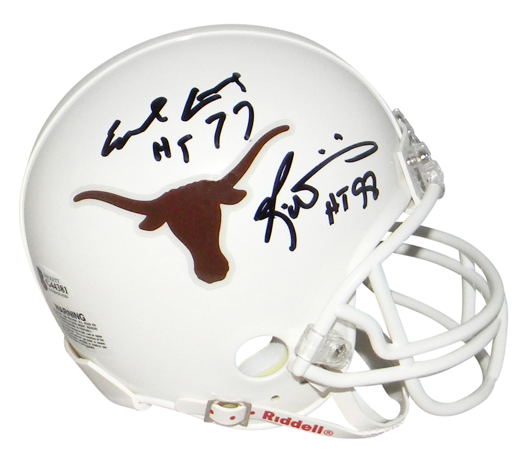 Earl Campbell and Ricky Williams, former Heisman Trophy winners for the Longhorns, have each hand signed this Texas Riddell mini helmet at a private signing. This item comes with a certificate of authenticity (COA) from Beckett Authentication Services and was signed in the presence of one of their representatives. You will receive a serial-numbered COA along with a matching serial-numbered sticker on the helmet. The authenticity can be verified online by entering the serial number.Item pictured may not be the exact item you will receive. It will be similar quality, and we guarantee your satisfaction.