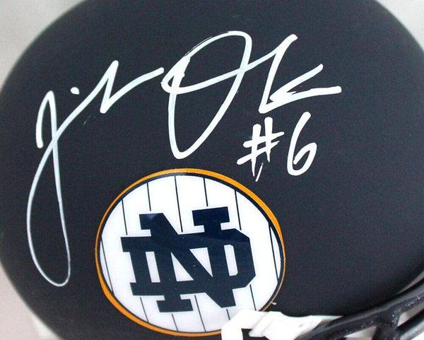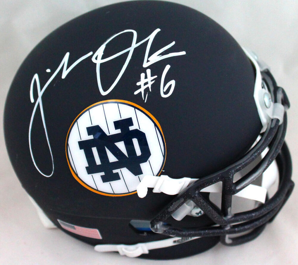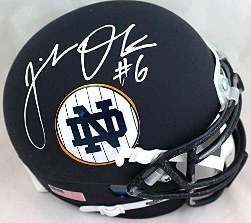 Jeremiah Owusu-Koramoah Autographed Notre Dame Alt. Schutt Mini Helmet- Beckett W Hologram This is a Jeremiah Owusu-Koramoah of Notre Dame Fighting Irish hand autographed schutt blue alt. mini helmet. This item has a Beckett Authentication, which comes with a Beckett numbered sticker hologram and a generic Beckett Certificate of Authenticity. You can view this item on the Beckett Authentication website and it shows when and where the item was signed. It was signed either at a public autograph appearance or a private signing. This is a stock photo of the item. Although you may not receive this exact item, the item you receive is virtually identical, brand new, and in great shape.