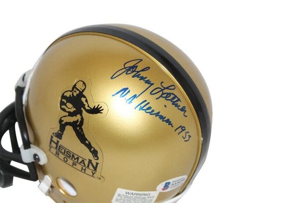 Johnny Lattner Autographed Heisman Trophy Replica Mini Helmet BAS 33027 The number in the listing title is just an inventory sku for our records and is not the authentication number. This is a Heisman Trophy replica mini helmet that was personally autographed by Johnny Lattner with Heisman inscription. Includes a certificate of authenticity from Beckett Authentication Services (BAS) and Denver Autographs.