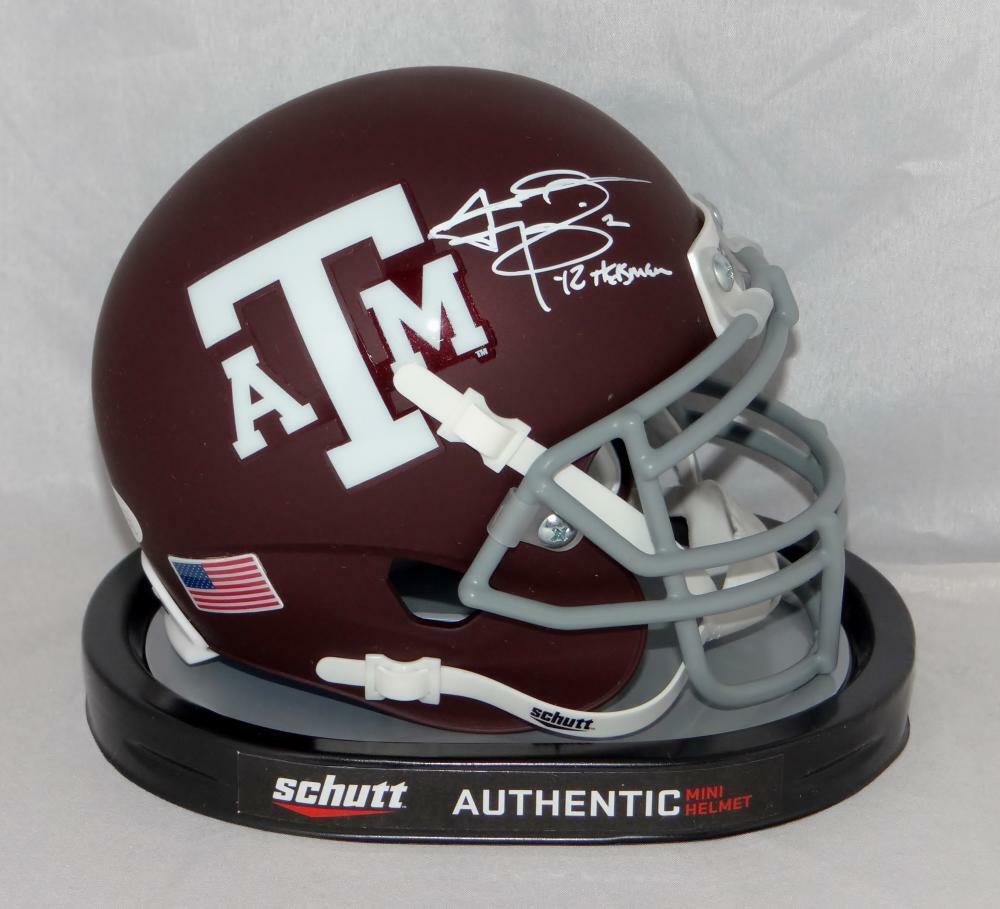 Johnny Manziel Heisman Signed Texas A&M Maroon Schutt Mini Helmet- JSA W Auth *White This is a Hand Autographed Helmet of Johnny Manziel of The Texas A&M Aggies. This is a Schutt Football Mini Helmet. This item has a James Spence Witness Protection Authentication, which Comes with a JSA #'ed Sticker and a Matching JSA COA. You can view this item on the SpenceLOA website and it shows when and where the item was signed. It was signed either at a public autograph appearance or a Private Signing. This is a stock photo of the item. Although you may not receive this exact item, the item you receive is virtually identical and brand new in great shape.