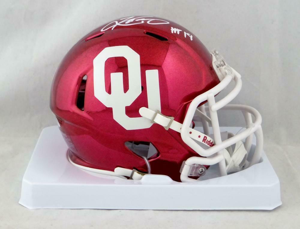 Kyler Murray Signed Oklahoma Sooners Chrome Speed Mini Helmet w/HT- Beckett Auth This is a hand autograph of Kyler Murray of the Oklahoma Sooners on a Riddell Football Mini Helmet. This item has a Beckett Authentication, which comes with a Beckett numbered and a matching Beckett Certificate of Authenticity. You can view this item on the Beckett Authentication website and it shows when and where the item was signed. It was signed either at a public autograph appearance or a private signing. This is a stock photo of the item. Although you may not receive this exact item, the item you receive is virtually identical and brand new in great shape.