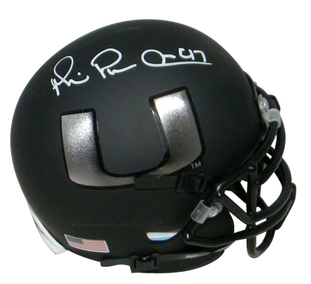 Michael Irvin, former All-American wide receiver for the Hurricanes, has hand signed this Miami Schutt mini helmet at a private signing. He included the inscription "It's all about the U" with his signature. This item comes with a certificate of authenticity (COA) from JSA - James Spence Authentication and was signed in the presence of one of their representatives. You will receive a serial-numbered COA along with a matching serial-numbered sticker on the helmet. The authenticity can be verified online by entering the serial number.Item pictured may not be the exact item you will receive. It will be similar quality, and we guarantee your satisfaction.