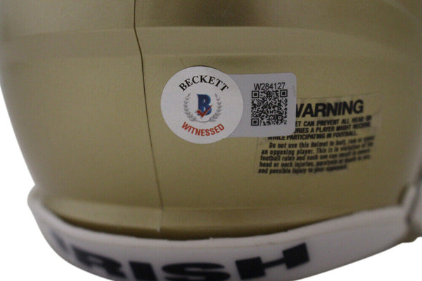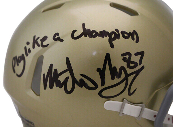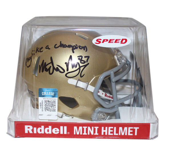 Michael Mayer Signed Notre Dame Fighting Irish Speed Mini Helmet Beckett 39129 The number in the listing title is just an inventory sku for our records and is not the authentication number. The item pictured is a stock photo unless otherwise noted. This is a Notre Dame Fighting Irish speed mini helmet that was personally autographed by Michael Mayer with Play Like a Champion inscription. Includes a certificate of authenticity from Beckett Authentication Services (BAS) and Denver Autographs.