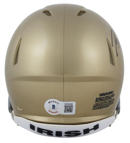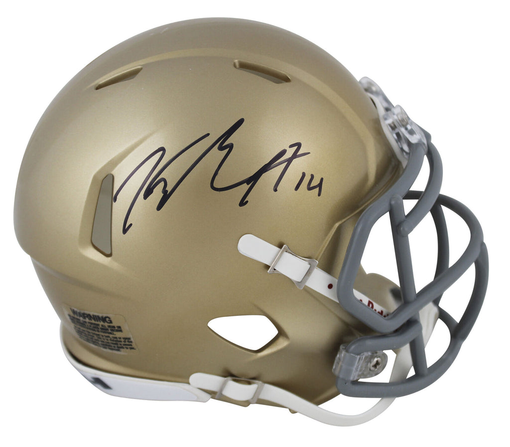 This Autographed Speed Mini Helmet has been Personally Signed by Kyle Hamilton of the Notre Dame Fighting Irish. This item is 100% Authentic to include a hologram by Beckett Authentication Services. This item may come with the new Beckett Authentication hologram that has a scannable QR code rather than the traditional COA. If you would like to have a COA, you are welcome to reach out to Beckett for a printed certification once you receive your item. This is a BAS Witnessed Protection Program item which means a Beckett Authentication Service representative was present when this item was being signed. We conducted an autograph signing with Kyle Hamilton where multiples of the same item were signed. While the photographs are representative of this item, the size, placement and strength of the signature may vary. Each item is hand signed, therefore, each autograph is unique. This item can be verified through BAS Witnessed.
