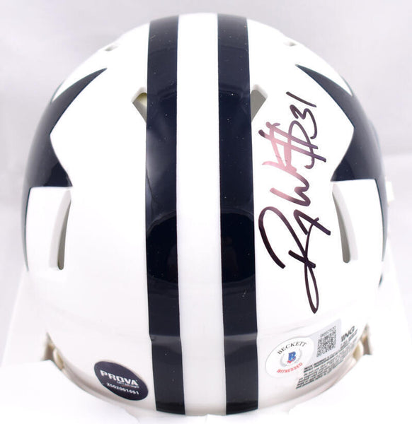 Roy Williams Autographed Dallas Cowboys 60-63 Speed Mini Helmet-Beckett W Hologram *Black This is a hand autograph of Roy Williams of the Dallas Cowboys on a Riddell Football 60-63 Speed Mini Helmet. This item has a Beckett Witness Authentication, which comes with a Beckett numbered hologram and a QR code for verification. You can view this item on the Beckett Authentication website and it shows when and where the item was signed. It was signed either at a public autograph appearance or a private signing. This is a stock photo of the item. Although you may not receive this exact item, the item you receive is virtually identical and brand new in great shape.