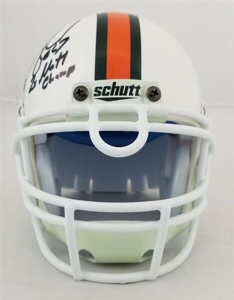 This autographed Schutt mini helmet has been personally hand-signed by Russell Maryland of the Miami Hurricanes. Maryland added the inscription "2x Natl Champ" along with his signature. Maryland won the college football national championship with Miami in 1987 and 1989. This autograph is certified by James Spence Authentication's (JSA) Witnessed Protection Program. That means that a JSA representative was present when this item was signed. It comes with the numbered hologram and matching Certificate of Authenticity.