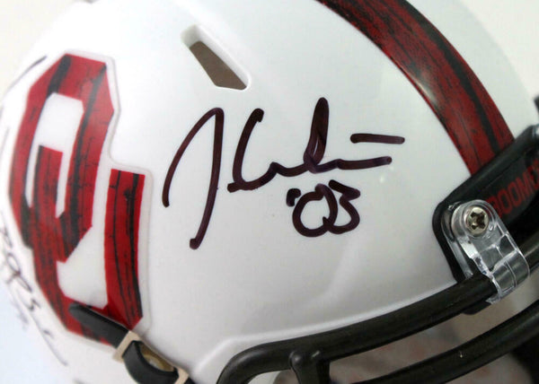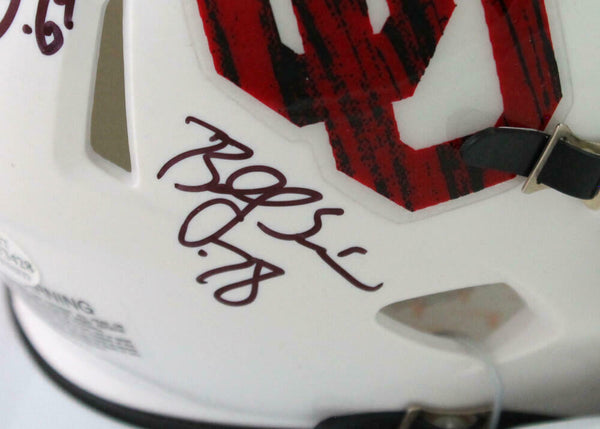 Sims, Owens, White Signed Sooners 'Bring the Wood' Mini Helmet - Beckett W Auth *Black These are hand autographs of Billy Sims, Steve Owens and Jason White of the Oklahoma Sooners on a Riddell Football "Bring the Wood" Speed Mini Helmet. This item has a Beckett Witnessed Authentication, which comes with a numbered and a matching Beckett Certificate of Authenticity. You can view this item on the Beckett Authentication website and it shows when and where the item was signed. It was signed either at a public autograph appearance or a private signing. This is a stock photo of the item. Although you may not receive this exact item, the item you receive is virtually identical and brand new in great shape.