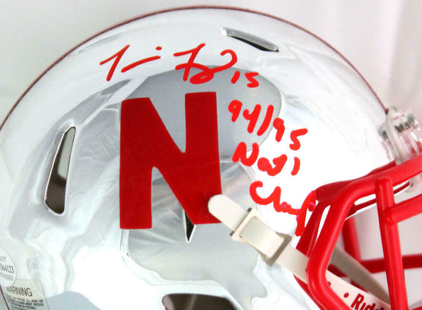 Tommie Frazier Autographed Nebraska Chrome Mini Helmet w/ Insc- Beckett W Auth *Red This is a hand autographed Helmet of Tommie Frazier of the University of Nebraska Cornhuskers. This is a Riddell Football Chrome Speed Mini Helmet. This item is inscribed with 94-95 Nat'l Champs. This item has a Beckett Witnessed Authentication, which comes with a numbered and a matching Beckett Certificate of Authenticity. You can view this item on the Beckett Authentication website. It was signed either at a public autograph appearance or a private signing. This is a stock photo of the item. Although you may not receive this exact item, the item you receive is virtually identical and brand new in great shape.