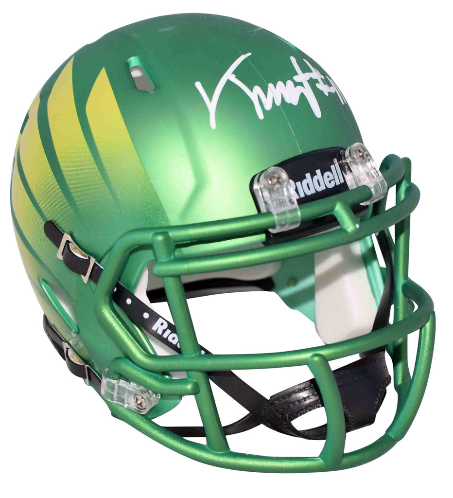 Troy Franklin, star wide receiver for the Ducks, has hand signed this Oregon Riddell Speed mini helmet at a private signing. This item is authenticated by Beckett Authentication Services and was signed in the presence of one of their representatives. Their tamper-evident hologram featuring a QR code and serial number is on the item. The authenticity can be verified online by entering the serial number or scanning the QR code.Item pictured may not be the exact item you will receive. It will be similar quality, and we guarantee your satisfaction.