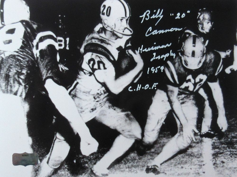 An LSU Tigers Unframed 8x10 B&W NCAA photo - Halloween hand signed by Billy Cannon. The item and signature are in excellent condition. In addition to signing his name, Billy also inscribed Heisman Trophy 1959 - CHOF on the item - Billy was LSU's first Heisman Trophy winner and first overall pick of the 1960 draft by the brand new Houston Oilers franchise Billy is an NFL Rushing Champion, 1960-61 AFL Champion, and College Football Hall of Fame Inductee - AUTHENTICATION: The item is accompanied by a Certificate of Authenticity - Serial Numbered and Databased Hologram - Picture of Billy from the signing