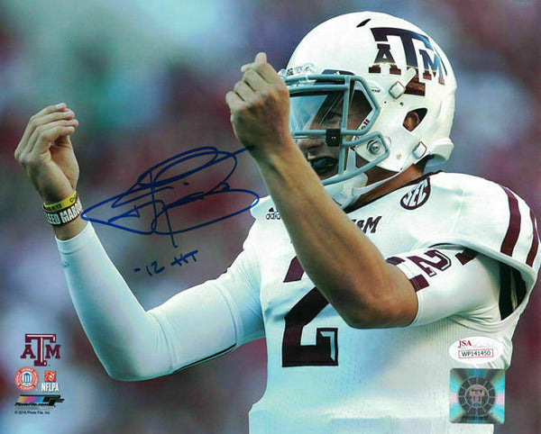 Johnny Manziel Autographed/Signed Texas A&M Aggies 8x10 Photo HT JSA 10996 PF This is an officially licensed 8x10 photo that was personally signed by Johnny Manziel with HT inscription.This photoincludes a certificate of authenticity from Denver Autographs and James Spence Authentication (JSA).